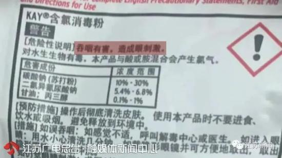 根据店长提供的外包装可以看到,小杜误食的正是肯德基、麦当劳、星巴克等餐饮企业常用的“含氯消毒粉”。