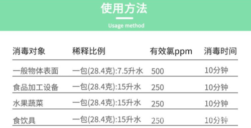 这种消毒粉经过不同比例的调配,可以用于一般物体表面消毒、奶昔机、圣代机、饮料机等食品加工设备表面、器具小杜、餐具消毒、水果蔬菜和织物的消毒。