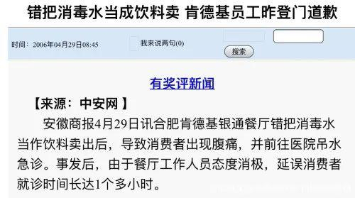 2006年4月,安徽商报报道合肥肯德基银通餐厅做完人员培训后,将培训用的消毒液放在了操作台上,工作人员误将消毒液当成饮料售出。