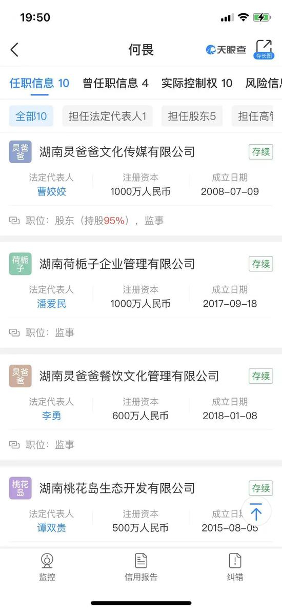 天眼查显示,除了“湖南炅爸爸文化传播公司”,何畏还投资了多家公司,并在多家公司中担任高管。《国际金融报》记者注意到,这些公司中有不少以“炅爸爸”为名,如湖南炅爸爸食品贸易有限公司(持股比例51%,已注销)、湖南炅爸爸餐饮文化管理有限公司(担任监事,存续)。