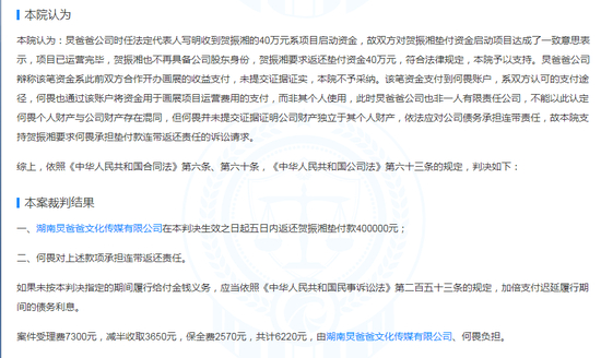 根据湖南省长沙市芙蓉区人民法院2019年3月20日出具的一审民事判决书,湖南炅爸爸文化传媒有限公司需在本判决生效之日起五日内返还贺振湘垫付款40万元;同时何畏对上述款项承担连带返还责任。