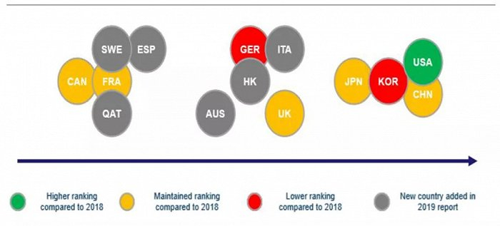 美国无线通信和互联网协会(CTIA)2019年联合电信咨询公司Analysys Mason发布的《Race-to-5G-Report》报告中,重点分析频谱可用性、牌照和部署计划等方面,比较了全球各国市场的5G进度情况,将中国、韩国、美国、日本列为5G整体准备进度的第一梯队。