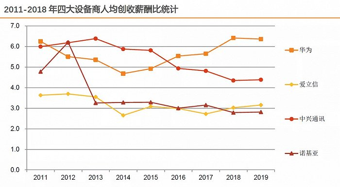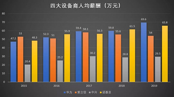从薪酬上看,前四大通信设备商中,中兴人均薪酬仅是另外三家一半。虽然中国有着工程师红利,但同是中国企业的华为,薪酬已经超越海外厂商,聚拢了一大批海内外人才,为其持续高速发展提供巨大助力。