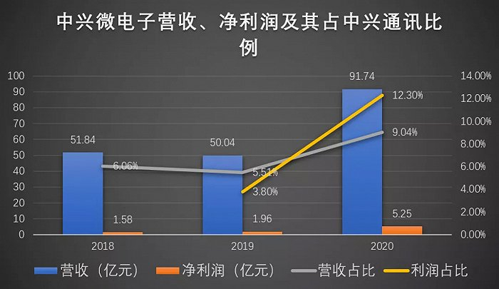 中兴微电子对中兴通讯的业绩贡献愈发明显,2020年更是突飞猛进,实现营业收入91.74亿元,归母净利润5.25亿元,分别占中兴通讯的9.04%和12.30%,为历史最高值。