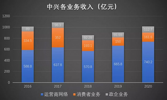 中兴通讯有三大业务,运营商网络、消费者业务、政企业务。