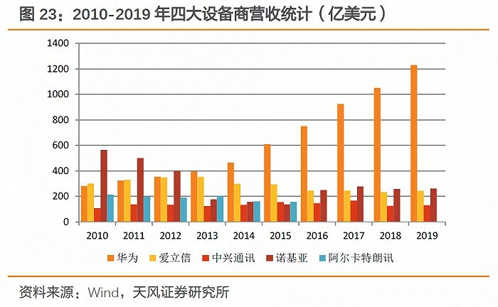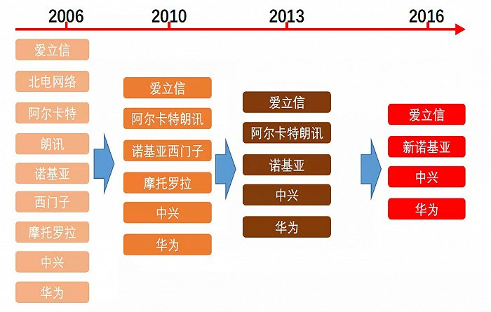 经过多年的竞争、并购,全球通信设备商目前已形成四大龙头,分别是华为、中兴、爱立信、诺基亚,格局空前清晰。