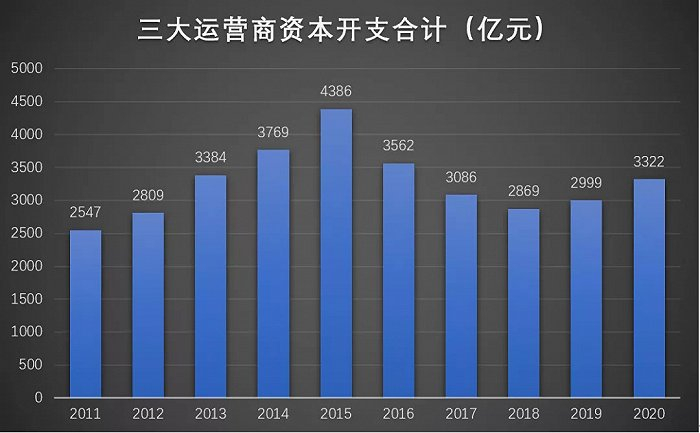 从我国运营商历年的资本开支看,2015年左右4G建设高峰后开始回落,基本维持在3000亿左右,近两年随着5G起势重新开启正增长。