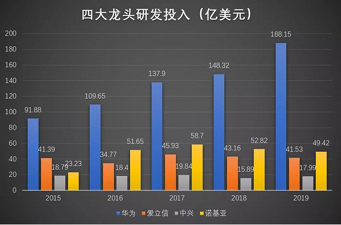 近五年,四家公司每年都投入巨额的研发费用,尤其华为,投入最多且年年正增长,2020年华为年报研发支出更是达到1418.93亿人民币,最低的中兴20年也投入了148亿元,普通公司根本没法承受。