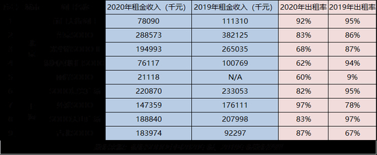 除去丽泽SOHO,北京区域的SOHO写字楼出租率相比2019年出现集体下降,其中光华路SOHO Ⅱ出租率降幅高达19%;上海区域的SOHO写字楼出租率属喜忧参半,但在租金收入上,除古北SOHO外,其它项目“跌跌不休”。