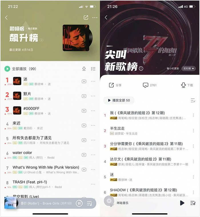 值得注意的是,在4月14日QQ音乐“飙升榜”中TOP3均为蔡徐坤新专辑作品,在咪咕音乐上蔡徐坤新专辑两首作品仅居5与23的位置,这则说明了粉丝更愿意到QQ音乐这样的平台上进行打榜,而非在同样价格的咪咕音乐上冲购买量。