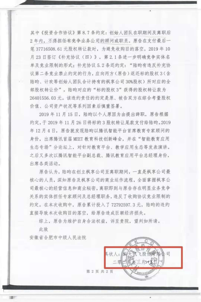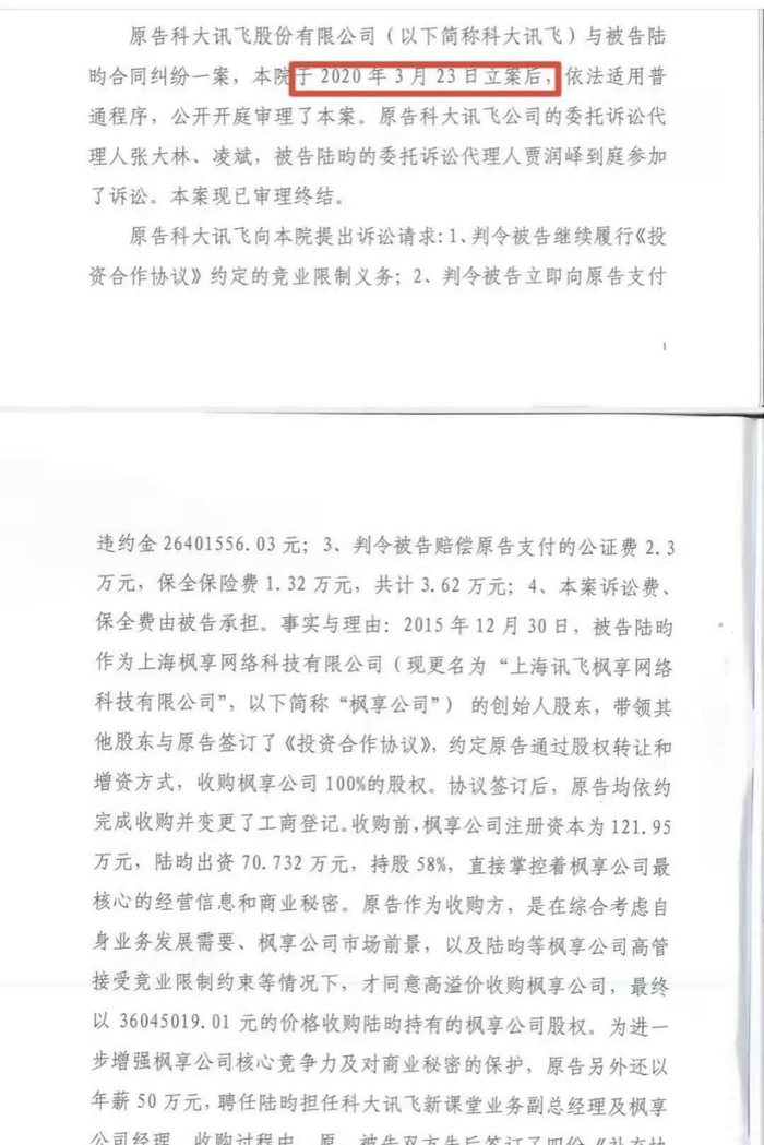 科大讯飞认为,陆昀在离职后即到存在明显业务竞争关系的实体担任专家顾问及总经理职务,违反了竞业限制的约定。而陆昀的违约直接导致此次收购目的落空,给科大讯飞造成巨额经济损失。