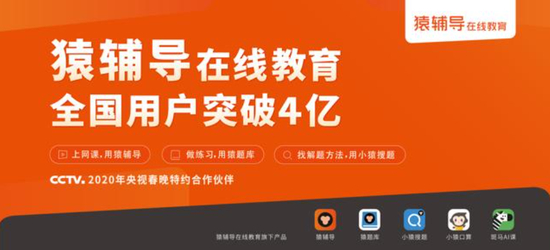 但大部分融资都被用在了广告投放上。早在2015年,猿辅导就投放了湖南台《天天向上》节目,2018年成为《最强大脑》的合作方,2020年成为CCTV《中国诗词大会》(第五季)独家互动合作伙伴。在2020年一季度,电视上、电梯间里乃至2020年的春晚,到处可见猿辅导的橙色Logo,和“累计用户4亿人”的广告语。