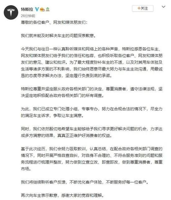 昨日深夜,特斯拉通过官方微博就未能及时解决车主的问题,发布致歉信。信中称,尊重并坚定服从政府各相关部门的决定,尊重消费者,遵守法律法规,坚决坚定地积极配合政府各相关部门的所有调查,并表示目前已成立专门处理小组,专事专办,努力在合规合法的情况下,尽全力的满足车主诉求,争取让车主满意。