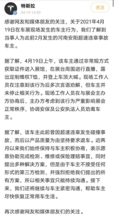 下午3时,特斯拉官方微博发表声明称,该车主为2月发生的河南安阳超速违章事故车主,以产品质量为由坚持退车,并且拒绝接受任何形式的第三方检测,否定了所有协商方案。在特斯拉官方的描述中,一个胡搅蛮缠的车闹形象彻底坐实了。