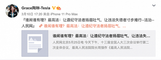 3月10日,陶琳曾在微博上转发了名为《谁闹谁有理?最高法:让遵纪守法者扬眉吐气,让违法失德者寸步难行》的文章,似乎暗指消费者车闹。