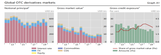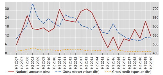 根据国际清算银行(BIS)的统计,全球场外衍生品合同名义金额规模在2013年超过700万亿美元后趋于稳定。2019年底的规模为550万亿美元。