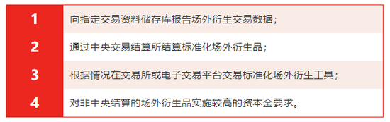 2008年全球金融危机中,由于场外衍生品本身具有非标准化、双边交易、不透明以及缺乏监管等结构性缺陷,成为风险的重要聚集地和爆发地。危机之后,G20提出了加强场外衍生品市场监管的具体要求,并要求金融稳定理事会(FSB)和国际证监会组织(IOSCO)予以落实。主要的监管强化措施集中在以下四方面:
