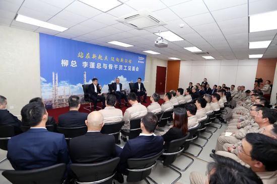 随后在联泓新科中控室举行的骨干员工见面会上,柳传志、李蓬一行与70余名联泓骨干员工代表进行了亲切的交流互动。