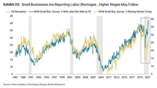 制造费用和原材料成本压力的不断上升的同时,工人薪酬也在不断上涨,尤其是对中小型企业来说。美国不断增加的财政刺激措施和失业救济金一定程度上导致了劳动力短缺,企业被迫支付更高的工人薪酬。
