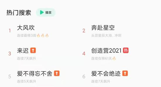 与之相对的是#大风吹 话题下60.1亿次的播放量,和QQ音乐平台上连续霸榜三周的搜索结果。