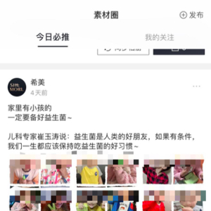 在希美APP中有一项内容为素材圈。据希美顾问“小明”称,素材圈是由公司官方发布,给代理商提供的专业卖货素材。新京报记者浏览希美账号发布的内容,发现其4月15日在推荐一款“澳尔丽益生菌固体饮料”产品时写道,“家里有小孩的,一定要备好益生菌~儿科专家崔玉涛说:益生菌是人类的好朋友,如果有条件,我们一生都应该保持吃益生菌的好习惯。”在文字下边则配有标称“澳尔丽益生菌固体饮料”的产品图,以及多张孩子、成年人手拿产品的图片。