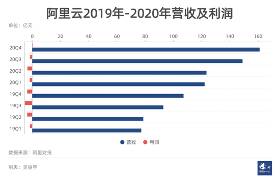 阿里云2020年收入556亿元,在国内各大云厂商中位居首位。阿里云经历10年亏损后,2020年四季度开始盈利,利润2400万元。这一数据相比过去10年的亏损微不足道。但可视为阿里云以亏损换规模扩张策略的重要拐点。