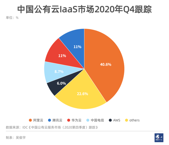 不过,另一家研究机构IDC 4月22日发布的《中国公有云服务市场(2020第四季度)跟踪》报告显示,阿里云以40.6%占据中国市场份额第一位,华为与腾讯并列第二,均为11%,中国电信和AWS位居其后,前五大服务商共同占据77.4%的市场份额。