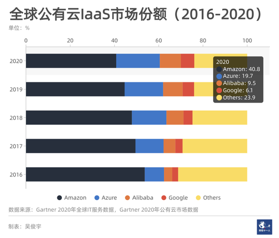 在Azure、阿里云、Google Cloud扩张影响下,AWS份额正在持续收窄,已从2016年的53.7%下降至2020年的40.8%;微软Azure从2016年的8.7%上升为2020年的19.7%。阿里云从2016年的3.7%上升至2020年的9.5%。