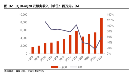 光大证券在今年3月发布的一份报告中则显示,腾讯云2020年三季度出现了同比收入增速下滑的情况。四季度腾讯云收入大幅增长,同比增速超过60%。