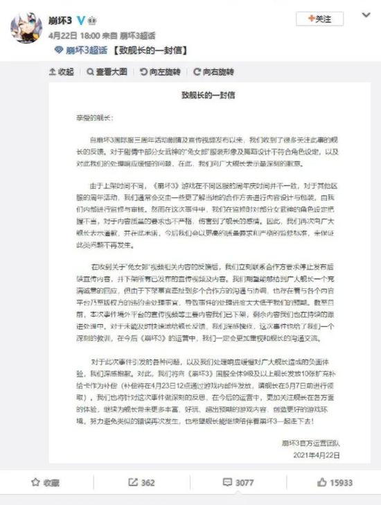 4月22日,在近一个月之后,米哈游官方终于针对旗下手游《崩坏学园3》(以下简称崩坏3)国际服“兔女郎事件”道歉,称由于监修不严而伤害了玩家(游戏中称“舰长”)感情,并保证此类问题今后不再发生。