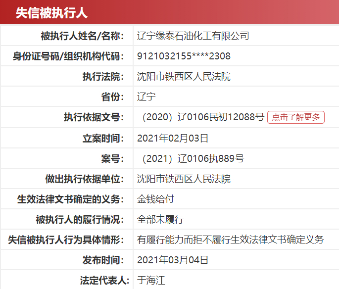 贝壳财经记者查询执行信息公开网获悉,辽宁缘泰于今年3月4日被沈阳市铁西区人民法院列为失信被执行人,执行依据文号为(2020)辽0106民初12088号,生效法律文书确定的义务为金钱给付,失信被执行人行为具体情形为有履行能力而拒不履行生效法律文书确定义务。
