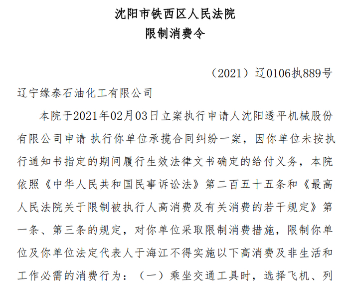 今年3月,辽宁缘泰及其法定代表人于海江两度被法院下发限制消费令,分别涉及与沈阳透平机械股份有限公司的单位承揽合同纠纷,以及与大连东方亿鹏设备制造有限公司债权纠纷。