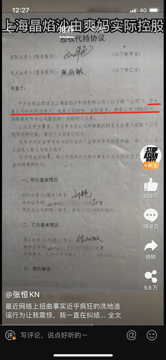 天眼查显示,上海晶焰沙成立于2019年,目前主控股东为陈明磊,持股比例90.00%。2021年3月,上海晶焰沙发生过股权变更,原始股东张丽敏、林慧艳及惠敏退出。但张恒同时曝光了一份代持合同,显示上海晶焰沙实际出资人为刘艳,也是唯一实际股东,持有公司100%股权,张丽敏则是签署代持的名义出资人。