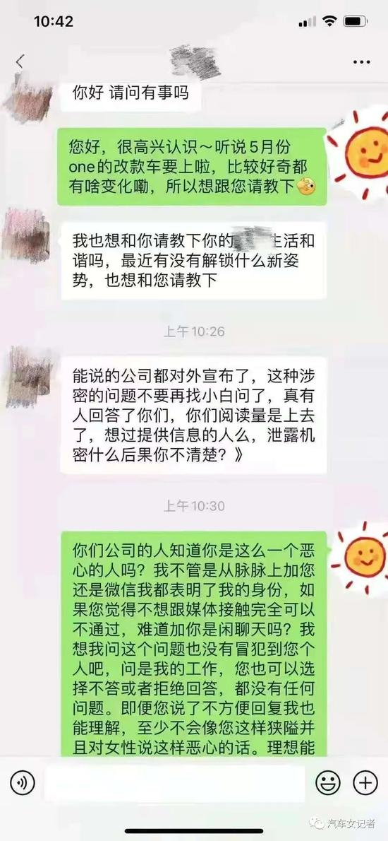然而,一波未平一波又起。昨天晚上,理想汽车创始人李想在微博上发了一条长微博,内容大致是:一个女记者通过脉脉,加了他们公司一个男工程师的微信,互相告知身份。女记者通过微信问男工程师关于理想ONE改款的问题,男工程师突然发飙,用侮辱性的语言进行回复。女记者找到理想公司,不仅要求处理这个男工程师,而且要求公开道歉。李想问,从法律和道德伦理层面,公司是否需要道歉?