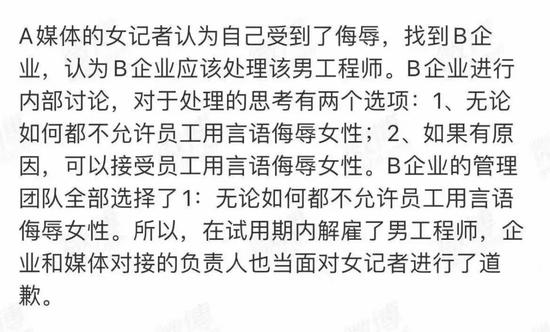 其二,李想为什么要发微博,显然,他是在对这位女记者的要求表示不满,后面的延申就更无厘头了——该员工是在本职工作范围外吗?是在大街上或论坛上侮辱跟工作没有关系的人吗?显然不是,这是两码事。