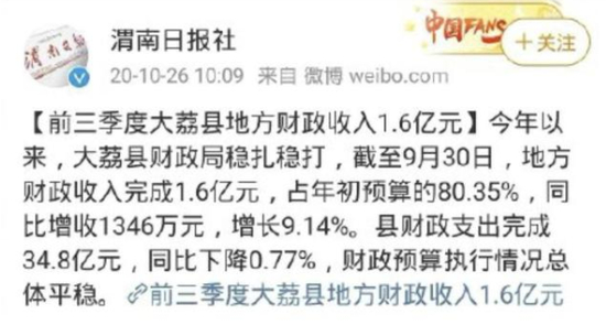还有不那么好笑的对比。有网友指出,2020年陕西省渭南市大荔县,一个常住人口接近70万的县,前三个季度收入是1.6亿,刚好是郑爽77天的收入。