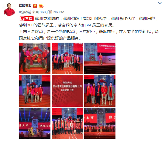 回归A股那天,周鸿祎发微博,说感谢党和政府,感谢各级主管部门和领导,感谢合作伙伴,感谢用户,感谢360的团队员工,感谢家人和360员工的家属。