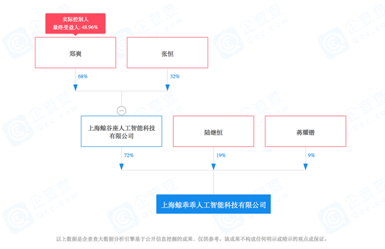 该公司的股东分别为上海鲸谷座人工智能科技有限公司(72%)、陆继恒(19%)和蒋耀锴(9%)。其中,张恒和郑爽二人共同持有鲸谷座72%的股份。而郑爽则是这家公司的实际控制人和最终收益人(占比约 48.96%)。