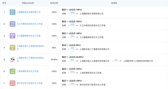 上海噶咕娱乐发展有限公司、九江羊群效应影视文化工作室、九江酷酷熊影视文化工作室、新沂影视文化工作室、上海郑爽影视文化工作室、新沂熊大熊二影视文化工作室、上海跳耀影视文化工作室,郑爽均为100%持股。其余公司除上海鲸乖乖人工智能科技有限公司外,郑爽均占据60%以上股权。