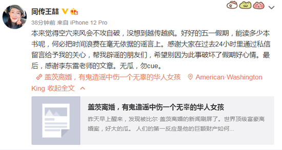 5日下午,王喆在微博再转发文章并表示,“本来觉得空穴来风会不攻自破,没想到越传越疯。好好的五一假期,能读多少本书呢,何必把时间浪费在毫无依据的谣言上。感谢大家在过去24小时里通过私信留言给予我的关心,帮我辟谣的朋友们,希望别因为此事破坏了假期好心情。最后,感谢李东雷老师的文章。无瓜,勿cue。”