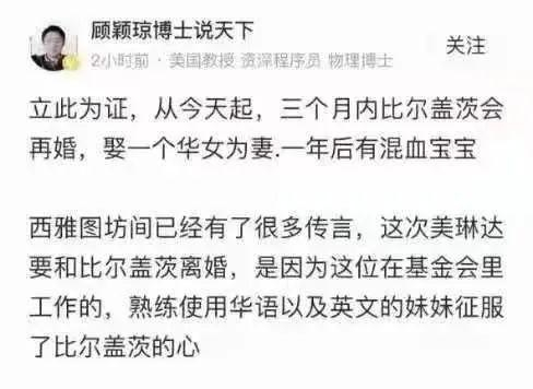 而在国内,社交媒体认证为美国教授、资深程序员、物理博士的社媒号“顾颖琼博士说天下”发布消息称:立此为证,从今天起,三个月内比尔·盖茨会再婚,娶一个华女为妻,一年后有混血宝宝。