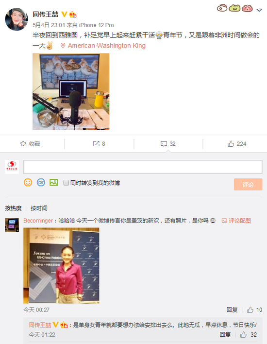 不过,这则消息很快就被当事人否认了。北京时间5月5日凌晨,网友在王喆微博“同传王喆”留言提问:“盖茨的新欢是你吗?”王喆就直接回复否认了:“是单身女青年就都要想办法给安排出去么。此地无瓜,早点休息,节日快乐。”