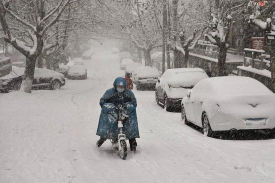 ●骑手在大雪中送外卖。