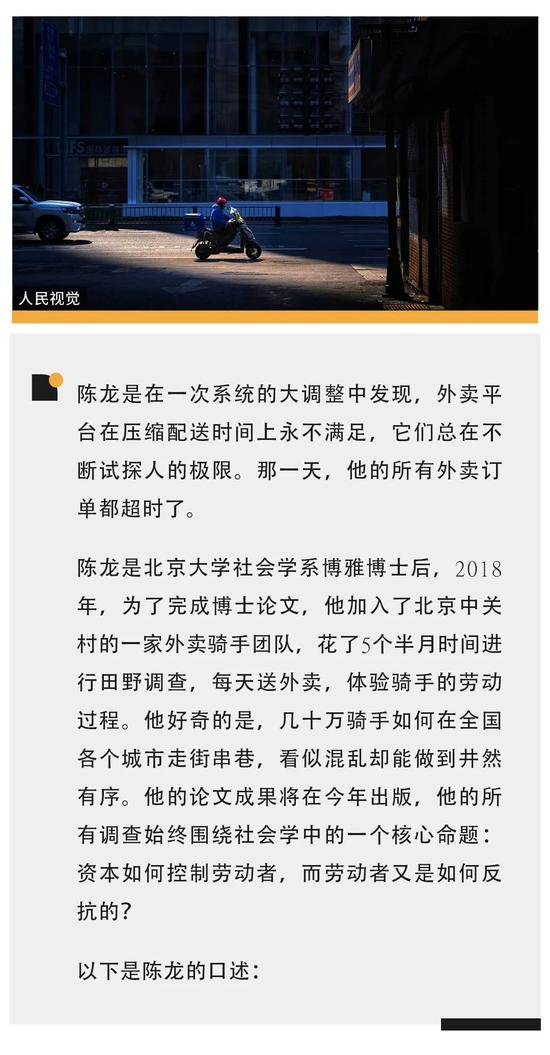 2018年我觉得换工作可能是一种反抗方式,但我现在已经不这么认为了,因为大家都在做平台,都是零工经济,你自以为走出一个牢笼,实际可能是进入一个新的牢笼。但没办法,因为很多骑手自身的条件就决定了,他不可能在劳动力市场上占据主导权。