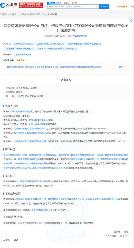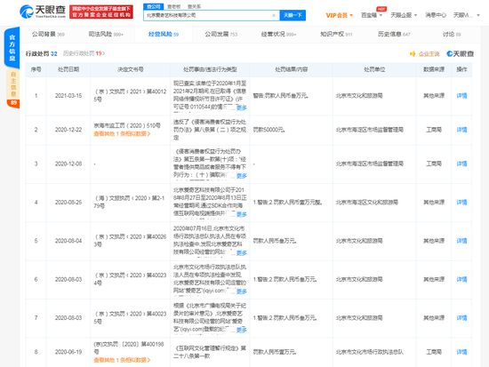 值得注意的是,北京鱼子酱传媒科技有限公司等雷瑛名下公司曾于2021年3月被北京市朝阳区人民法院冻结财产约2904万元,关联案件案号为(2020)京0105财保1612号;北京奇艺世纪科技有限公司、北京爱奇艺科技有限公司则涉及多条法律诉讼,案由多为侵害作品信息网络传播权纠纷、著作权权属、侵权纠纷等;同时后者曾多次被行政处罚,其中处罚事由包括传播的视听节目含禁止内容、广告不能够使消费者辨明其为广告、违反《侵害消费者权益行为处罚办法》等,多数处罚结果为罚款1万或5万元。
