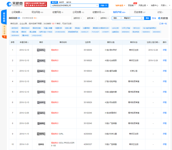此外,爱奇艺关联公司北京奇艺世纪科技有限公司此前曾陆续申请“青春有你”相关商标,而北京爱奇艺科技有限公司则于近日登记“《青春有你3》豆仔背景图稿”、“《青春有你3》豆仔动作图稿”的作品著作权。