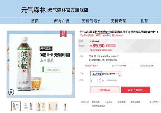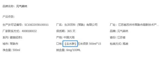 YOUNG财经点开天猫元气森林官方旗舰店还发现,健美轻玉米须茶的页面标注着“祛湿、去水肿”字样。商品详情口味一栏也标着“去水肿”字样。(见上图)