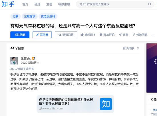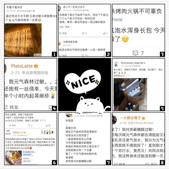还有网友抱怨“第一次喝元气森林白桃气泡水不到五分钟脸全身过敏,以为是吃别的导致的,第二天又喝了两、三口,一分钟后全身严重过敏。”