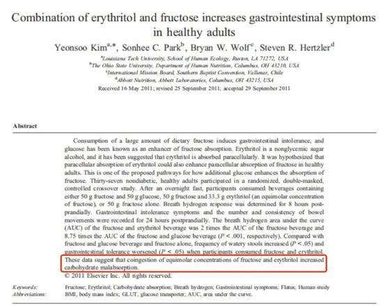 在上图《赤藓糖醇与果糖结合会增加健康成年人的胃肠道症状》一文中指出,37名非糖尿病、健康的成年人在禁食一夜之后,饮用含有50克果糖和50克葡萄糖、50克果糖和33.3克赤藓糖醇的饮料,或仅摄入50克果糖。结果显示,摄入等摩尔浓度的果糖和赤藓糖醇,腹部所产生的气体是果糖和葡萄糖的8.75倍,是只喝果糖饮料产生腹部气体的2倍。
