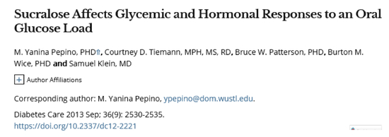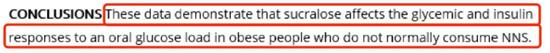 上图《三氯蔗糖影响血糖和激素对口服葡萄糖负荷的反应》一文中提出,三氯蔗糖会影响通常不食用NNS(非营养性甜味剂)的肥胖人群对口服葡萄糖负荷的血糖和胰岛素反应。